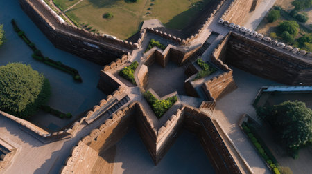 This stunning aerial view showcases a historical fort with an intricate star-shaped design, surrounded by lush greenery and charming pathways.