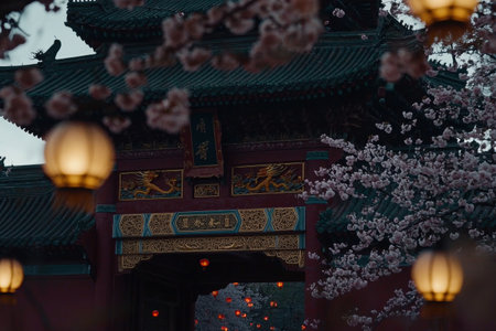 A captivating image of a traditional Asian temple gate adorned with cherry blossoms in full bloom Illuminated by warm-toned lanterns it evokes a sense of peace and tranquility The intricate details of the architecture are showcased beautifully