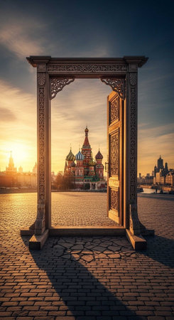 A stunning view of St. Basil's Cathedral in Moscow through an ornate doorway at sunset