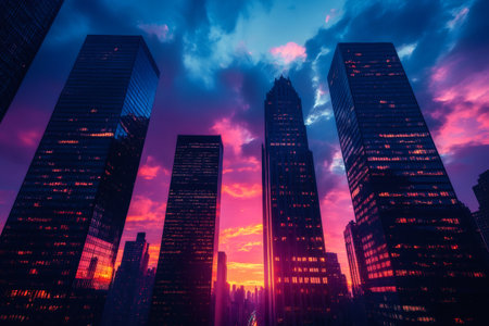 Low-angle view of modern skyscrapers in a city, showcasing urban architecture and cityscapes at dusk or dawn