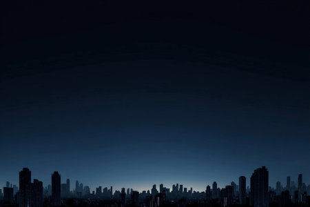 City skyline appears at night with silhouettes of buildings and a few lights shining.