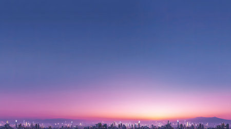 Experience the beauty of a city's skyline at twilight, with vibrant hues of purple and pink creating a stunning backdrop for illuminated skyscrapers and urban scenery.