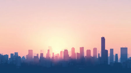 A captivating view of a city skyline during the golden hour, showcasing silhouetted buildings bathed in soft, warm light. This serene urban landscape captures the essence of evening tranquility, perfect for travel or lifestyle imagery.