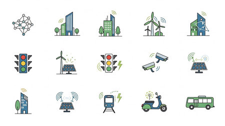 Smart city showing smart city including buildings wind turbines solar panels traffic lights security cameras train scooter and bus. resolution...