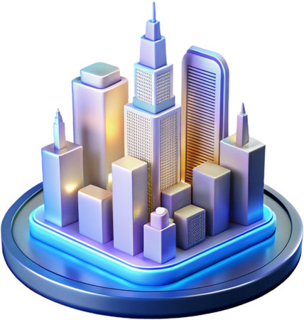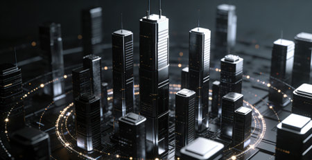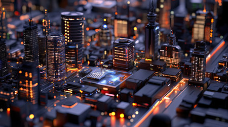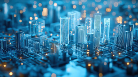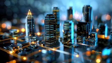A conceptual visualization of a smart city with glowing structures on a digital circuit board, symbolizing urban technology integration concept. AIG41