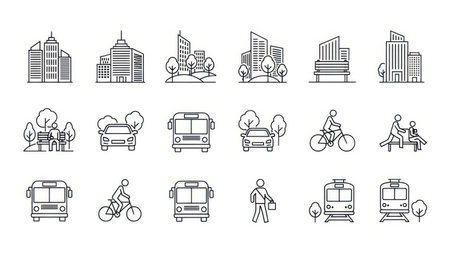 Buildings line icons. Bank, Hotel, Courthouse. City, Real estate, Architecture buildings icons. Hospital, town house, museum. Urban architecture, city skyscraper, downtown. Vector
