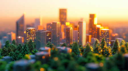 Hyper realistic tilt shift photography of a modern cityscape with skyscrapers and green park