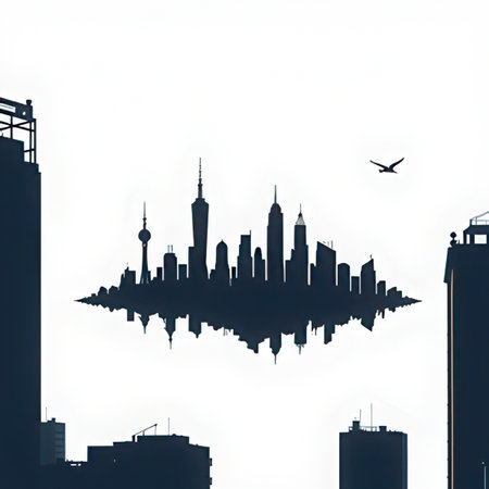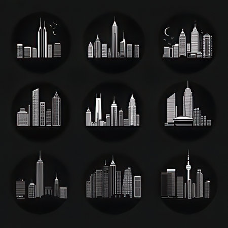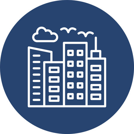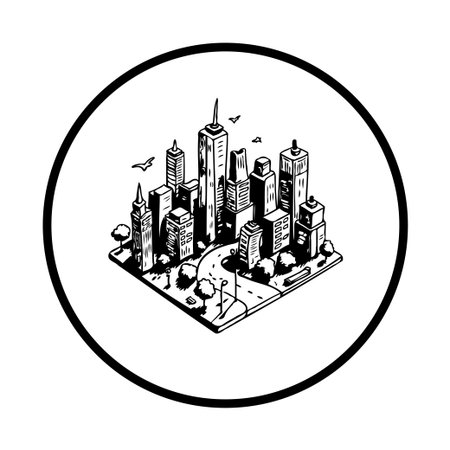 A minimalist hand-drawn illustration of a cityscape, featuring iconic buildings and urban elements. It is an architectural marvel within a circular frame, conveying modern design and development.