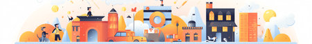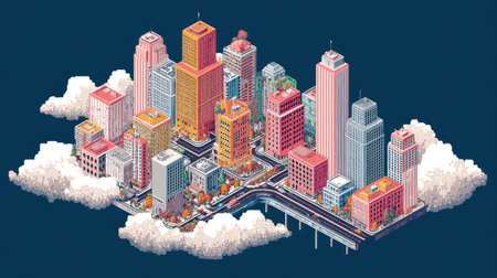 A colorful cityscape with a large building in the middle. The buildings are in different colors, and the city appears to be lively and vibrant