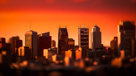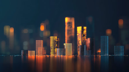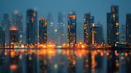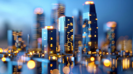 A stunning city skyline at sunset featuring modern buildings illuminated by vibrant bokeh lights. This abstract view captures urban beauty and energy.