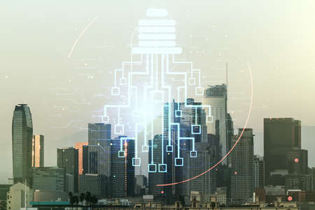 Double exposure of virtual creative light bulb hologram with chip on Los Angeles city skyscrapers background, idea and brainstorming concept