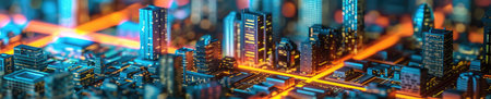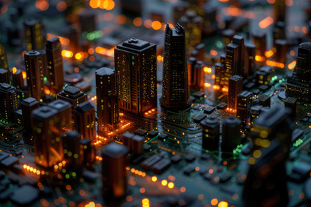 Closeup of miniature buildings simulating a cityscape on a vibrant circuit board