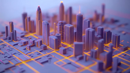 Digital illustration of a city composed of geometric shapes. The buildings and streets are represented by blocks and lines that are highlighted with a warm yellow-orange glow. The overall color palette is shades of purple and gray, creating a futuristic and abstract impression.