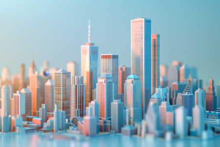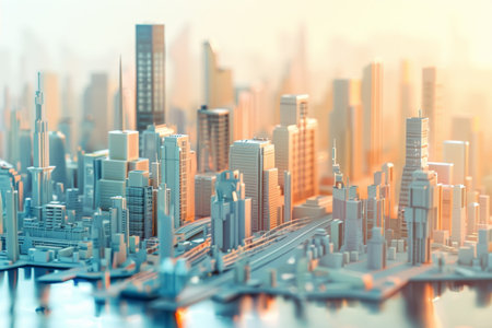 Minimalist futuristic cityscape in soft lighting, featuring eco-conscious urban design, clean forms, and efficient space usage in a 3D rendered urban setting