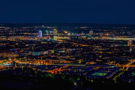 Aerial panoramic cityscape view with bright lights in night Munich