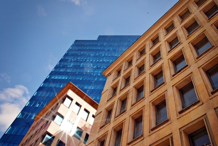 Prague, Czech Republic - January 22, 2021 - Newly built office buildings bring new life to a part of Prague called Holešovice on a sunny winter day