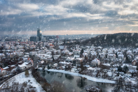 Aerial cityscape view of Brno, capital of South Moravian region of the Czech Republic on 9 February 2025