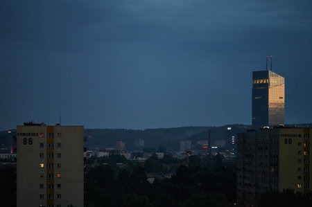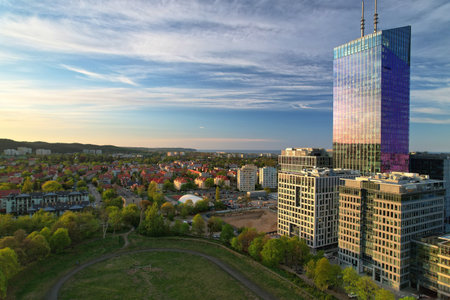 Gdańsk Cityscape at Dusk: Pomorska Buildings and Sky Tower Against the Evening Sky