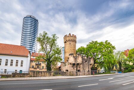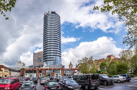 JENA, GERMANY - CIRCA APRIL, 2019: The Pulverturm and shopping mall Neue Mitte of Jena in Thuringia, Germany