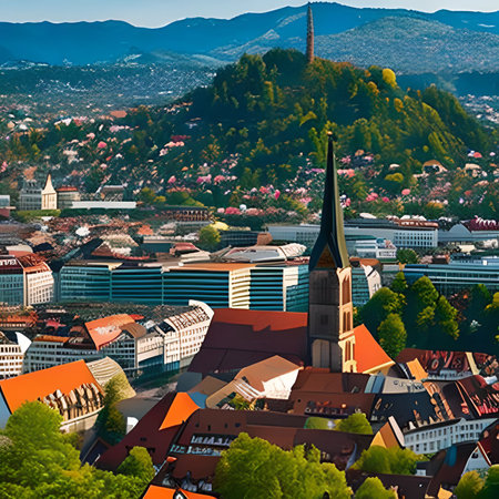 Panoramic view from view-point Fuerstenstand on mountain Plabutsch to town Graz on a sunny summer day in Styria, Europe