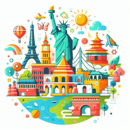 Travel around the world concept with famous monuments and landmarks. Vector illustration