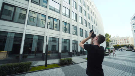 Photographer takes pictures of citys modern architecture. Action. Young man shoots modern architecture with professional camera. Photography is hobby