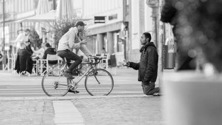 INNSBRUCK, AUSTRIA - NOVEMBER 1st 2015: Refugee begging for help in the streets of Innsbruck with people walking by.