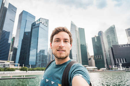 Tourist posing in front of Singapore skyline