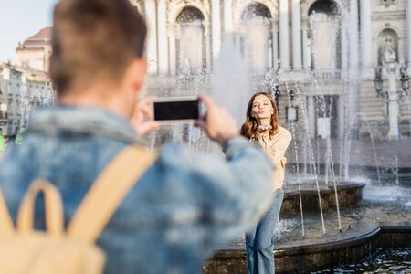 Man taking a picture of his boyfriend at fountain in a city.