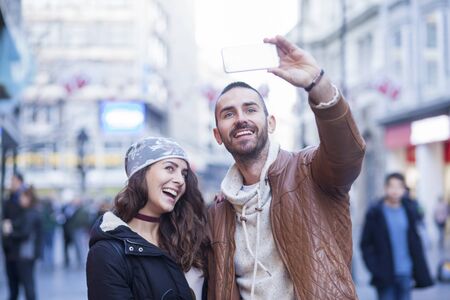 Young happy couple making photos in a tourist place on their vacation