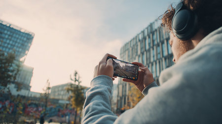 I need to capture this before the sun sets. Cropped shot of an unrecognizable man taking a photo of the city with his cellphone outside.