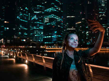 Woman holding smartphone for self-portrait photo with view of modern skyscrapers at night