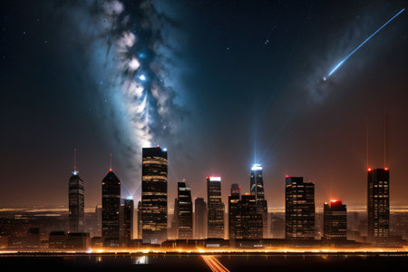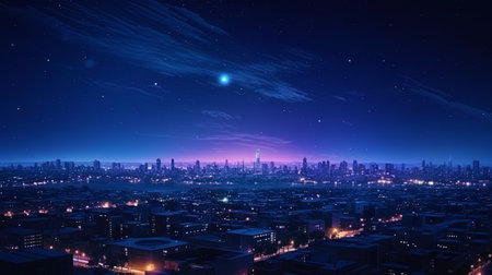 Skyline of tall buildings under a starry night sky, perfect for urban and night photography themes. Generative AI