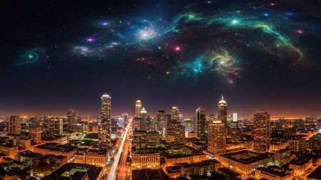 City skyline overlaid with data constellations, abstract representation of business intelligence under a cosmic night sky
