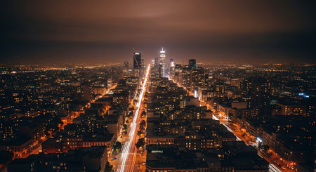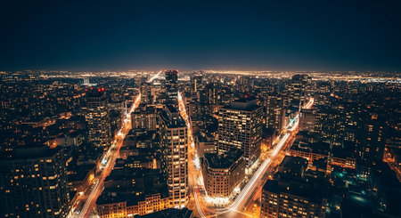 An expansive aerial perspective of a bustling city at night. Countless buildings and skyscrapers are illuminated, casting a warm, golden glow across the urban landscape. Streets are visible as ribbons of light, hinting at the constant movement of traffic. The sheer density of lights creates a vibrant and energetic atmosphere, showcasing the vastness and complexity of the metropolis after dark.