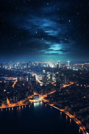 Starry night reveals vibrant city lights against a contrasting dark sky