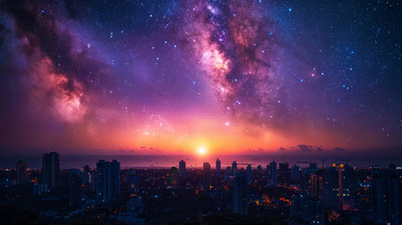 A breathtaking view of a modern city skyline at dusk, featuring vibrant clouds and stars. The scene captures the essence of urban beauty and tranquility.