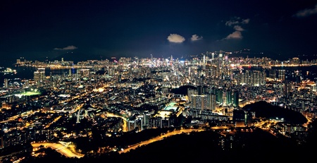 Overlooking a vibrant city skyline at night, countless lights twinkle from buildings and streets, showcasing the bustling urban life below from a high elevation.