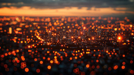 This captivating image showcases a blurred urban skyline at dusk, with glowing lights creating a serene atmosphere. The bokeh effect adds an artistic touch, enhancing the tranquil scene.