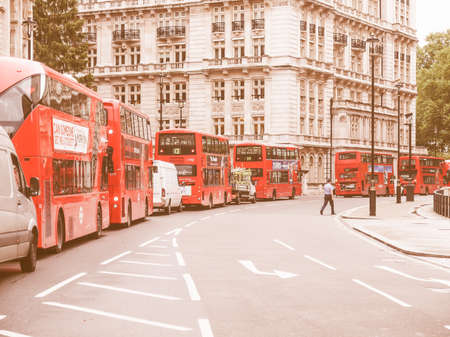 LONDON, ENGLAND, UK - OCTOBER 23: Row of double decker red buses waiting to depart from on October 23, 2013 in London, England, UK vintage