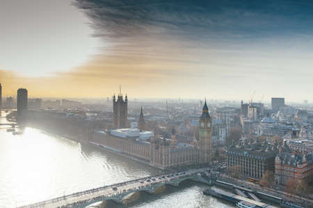 Aerial panorama view on London. View towards Houses of Parliament, London Eye and Westminster Bridge on Thames River.