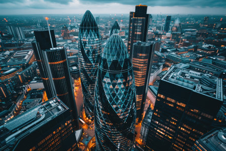 United Kingdom, London: Aerial view of Londons financial district at sunset, featuring modern skyscrapers and iconic landmarks against a vibrant sky. Drone flight