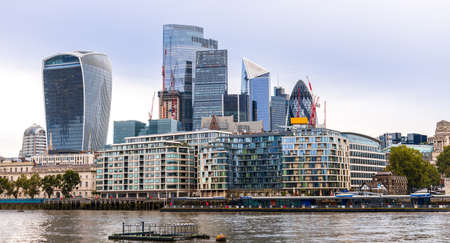 London - 18 July 2020 - View of London City Skyline with Modern Architecture from London Bridge Riverside during Covid 19 Pandemic, London UK