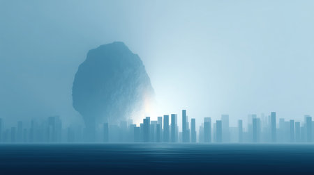 Morning fog blankets a city skyline, creating a serene and mysterious atmosphere over urban buildings.