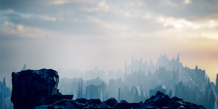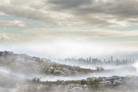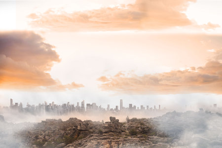 Flat design showing rocky plateau and mist surrounding distant skyscrapers under golden clouds. Landscape, panoramic, minimalist, urban, aerial, atmospheric, sunrise