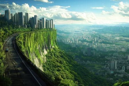 A modern cityscape with towering buildings sits atop a steep green cliff, overlooking a fertile valley below.
