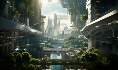 Generative AI illustration of rendering of a city of the future. city is sustainable and efficient. The buildings are interconnected by a network of green spaces, and the city is powered by renewable energy.