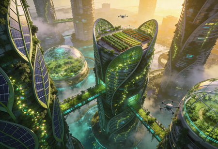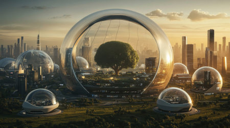 Visualizing a Sustainable Future With a Smart City Design Featuring Green Domes and a Central Tree Promoting Air Quality and Renewable Energy Generative AI