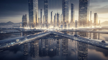 Modern city blending with future tech, sunset skyline layered with glowing digital paths, nodes, and circuit board designs
