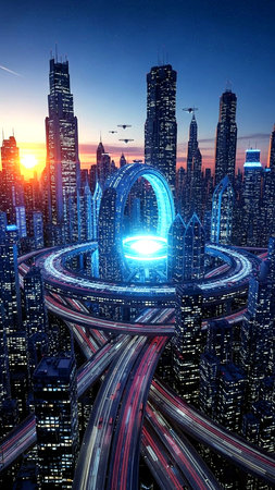 An artist's rendering depicts a futuristic city with sleek skyscrapers and flying vehicles. The composition features a circular platform overlooking the metropolis. The color palette includes blues, oranges, and purples, suggesting a sunset or sunrise. This image could be used for conceptual or illustrative purposes in a variety of media.